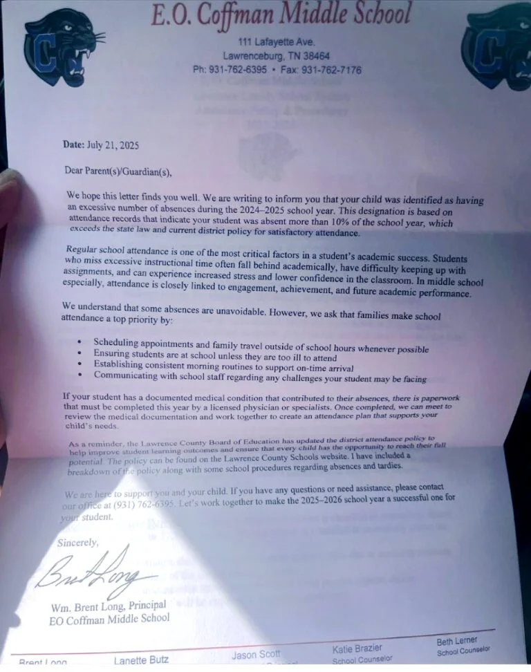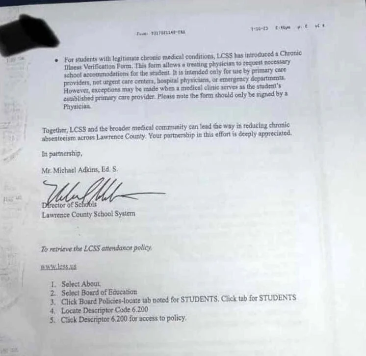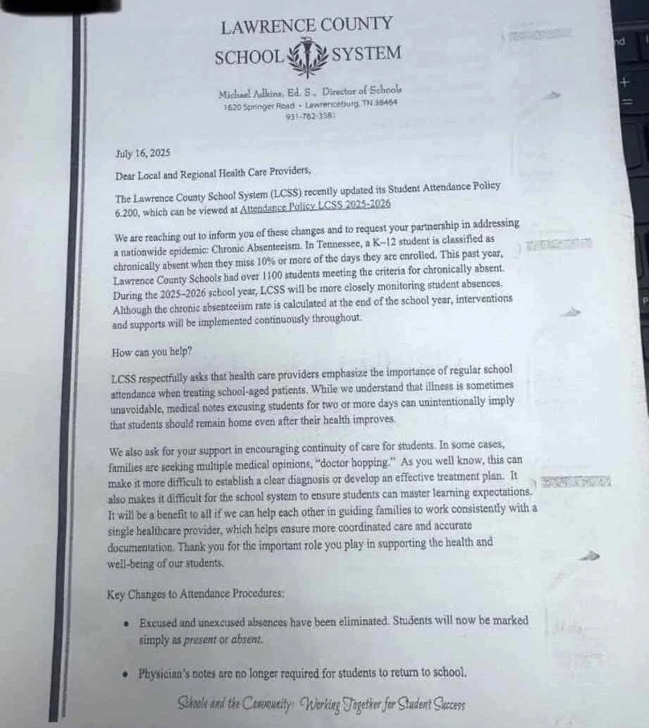 Lawrence County Director of Schools Michael Adkins sent a letter addressed to local and regional healthcare providers, informing them of the new attendance policy and accusing parents of “doctor hopping.” Adkins encouraged healthcare providers to “guide families to work with a single healthcare provider.” He expressed how a partnership with Lawrence County schools would be greatly appreciated.