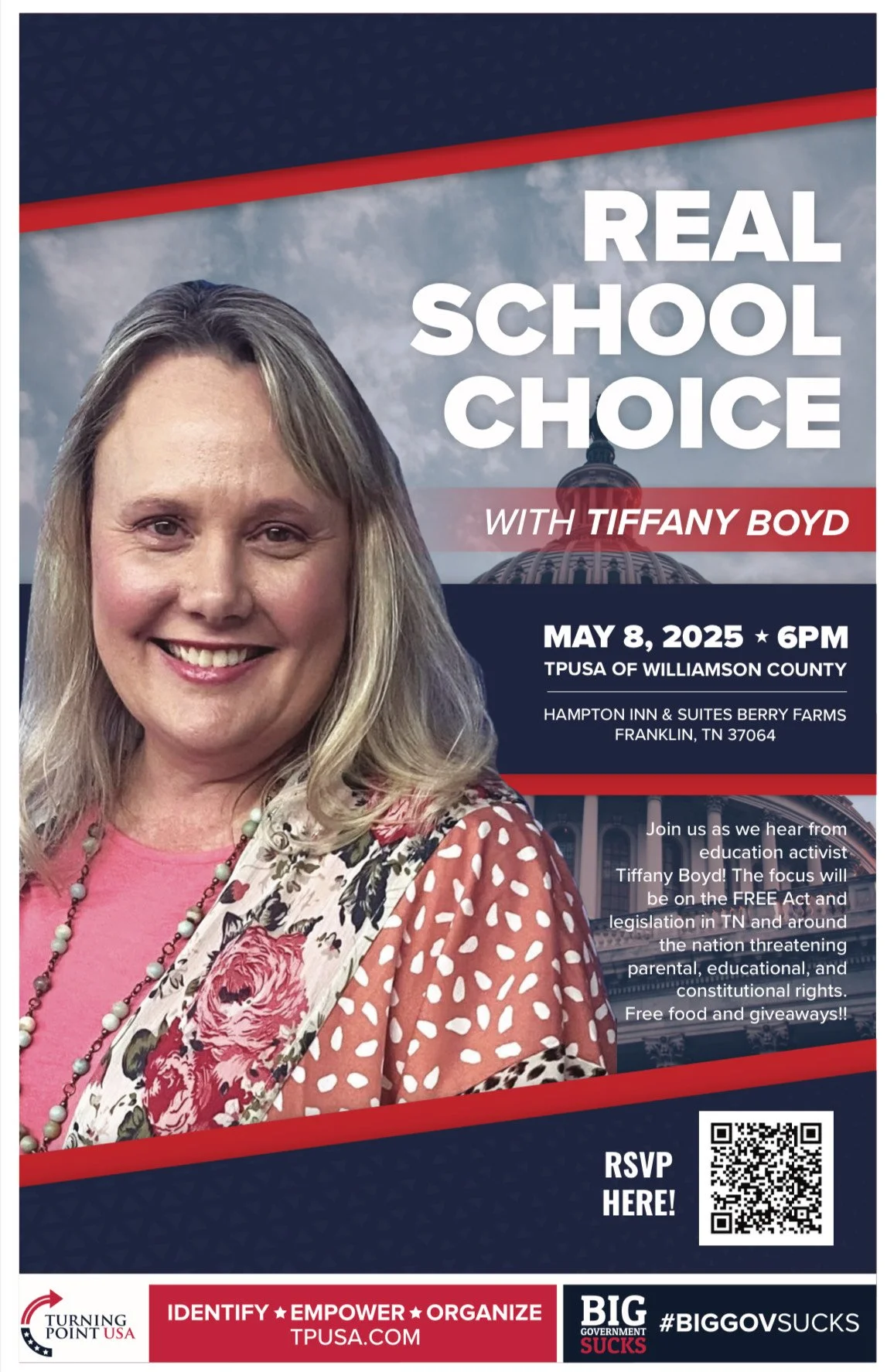 Registration Link: https://www.ticketleap.events/tickets/tpusa-of-williamson-county-tn/real-school-choice-with-tiffany-boyd?fbclid=IwY2xjawJ5K5hleHRuA2FlbQIxMABicmlkETFDUjhpZ0lNODZ6VFo3UGRlAR4h514e53i9SNwW3iQLi1n0gS3F3E5s-50_Tbo7nKUuSJBPMKMmPpC1kVVoDg_aem_h1jnnPuP203m-6NSBFoEag